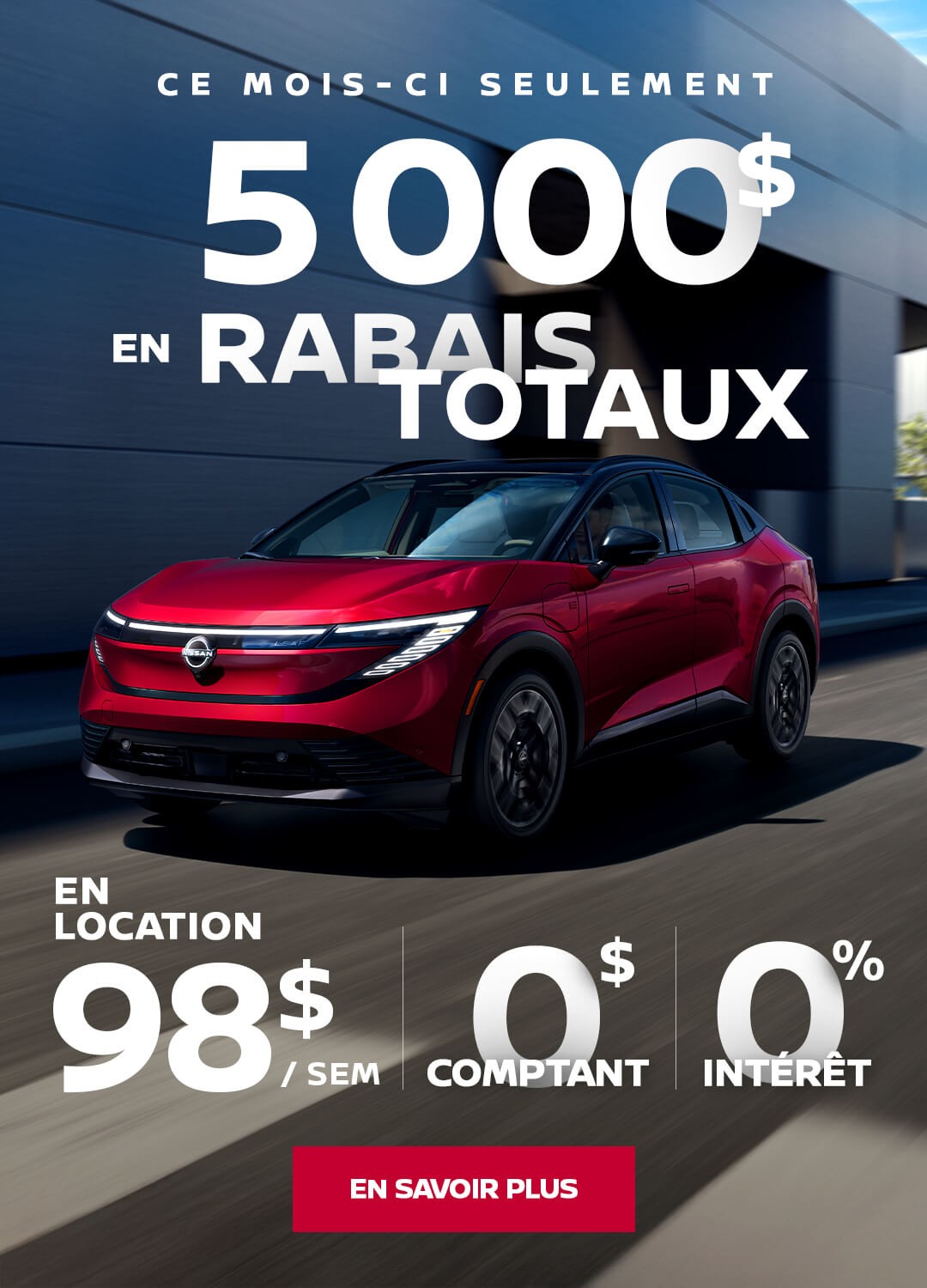 En plus de conseils judicieux, nous aimons toujours offrir une valeur ajoutée pour nos clients. C’est pourquoi nous vous proposons toujours des promotions sur des modèles variés. Découvrez les offres du moment chez Nissan de Drummondville et restez à l’affût des nouveautés !