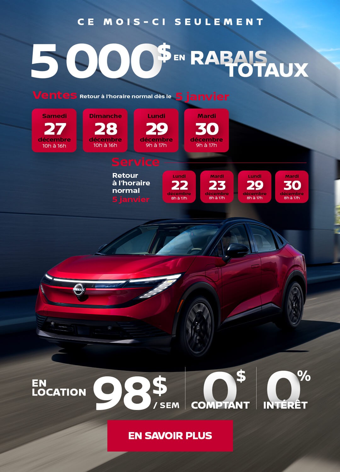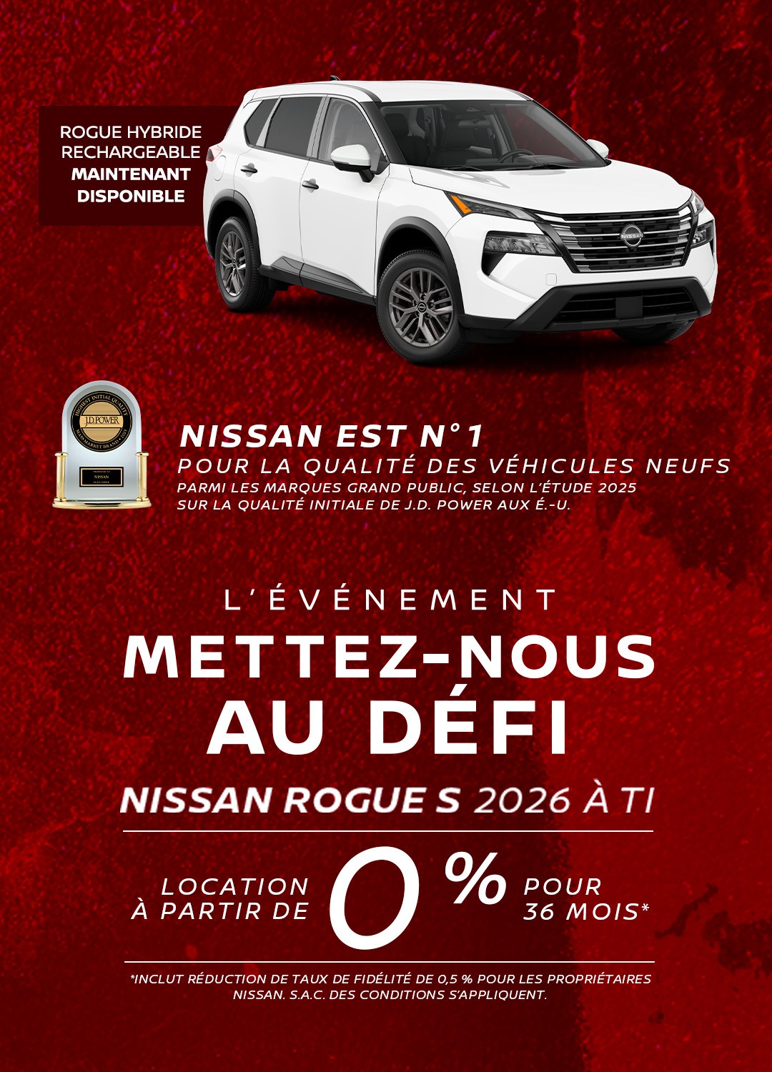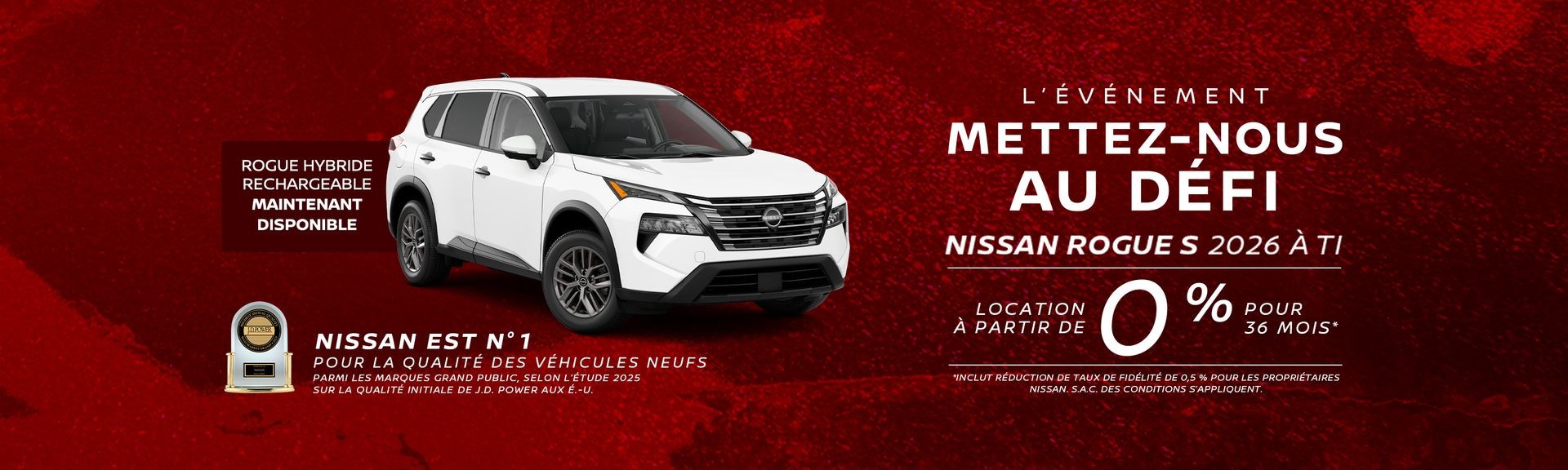 En plus de conseils judicieux, nous aimons toujours offrir une valeur ajoutée pour nos clients. C’est pourquoi nous vous proposons toujours des promotions sur des modèles variés. Découvrez les offres du moment chez Nissan de Drummondville et restez à l’affût des nouveautés !